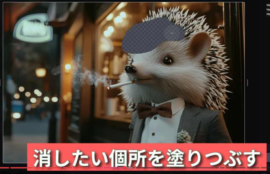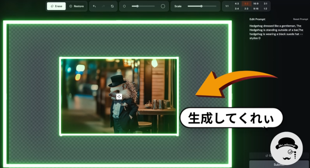 消しゴム機能+新たな生成物を加えたい場合、同じように変更したい箇所を消しゴムで消して(例:頭の上に帽子)、追加のプロンプトを入力することで、新しいものを書き加えることができます。