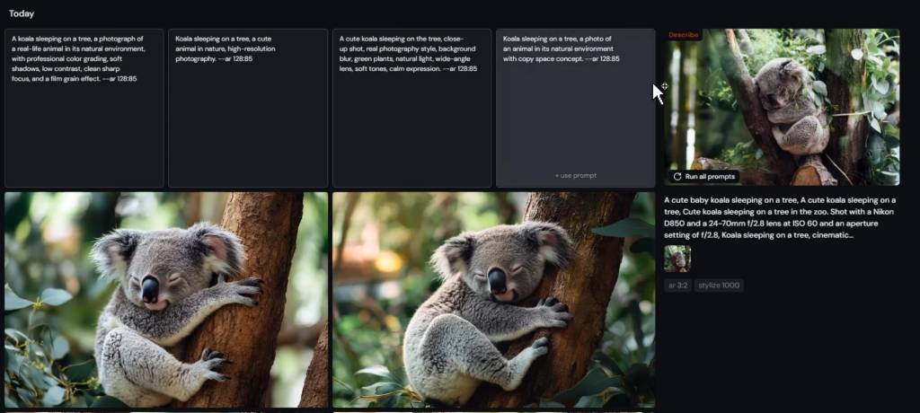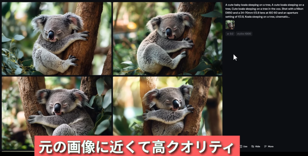 すると、『ミッドジャーニー(Midjourney)』が画像を解析して、このような画像を生成する候補となるプロンプトを出してくれる。下図参照。