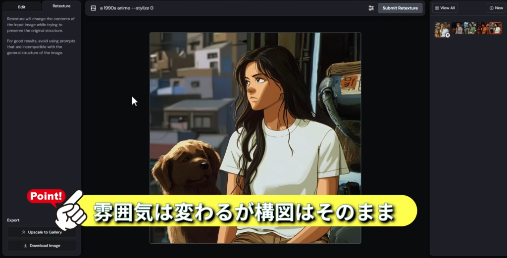 雰囲気や構図をそのままにして再生成できる。下図は1990年代のアニメ風に再生成した場合。