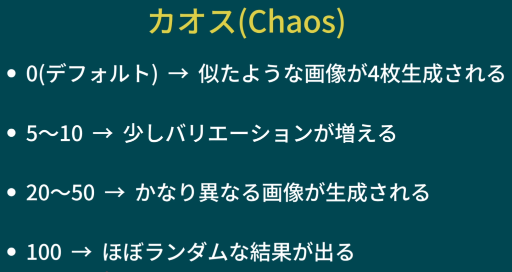 ランダム性のことだが、上げすぎると訳が分からないものになっていってしまうので、一般的には、おおよそ2~7くらいが良いとされる。