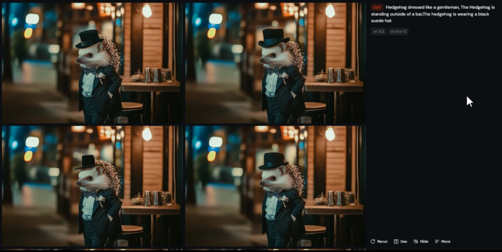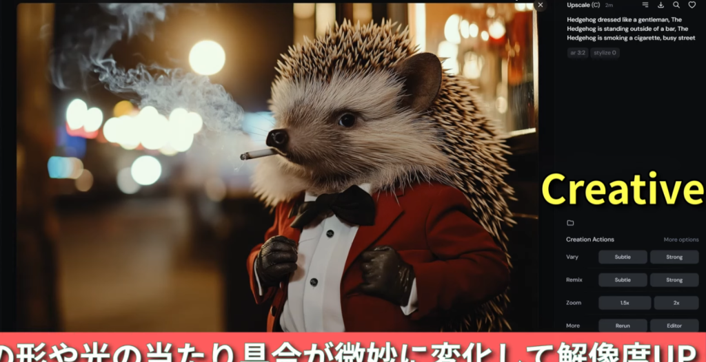 紳士のような服を着たハリネズミ。ハリネズミはバーの外に立っている。