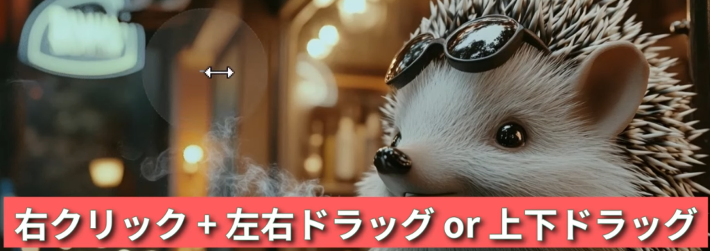 右クリックに上下左右のドラッグによって消しゴム範囲の拡縮できる。