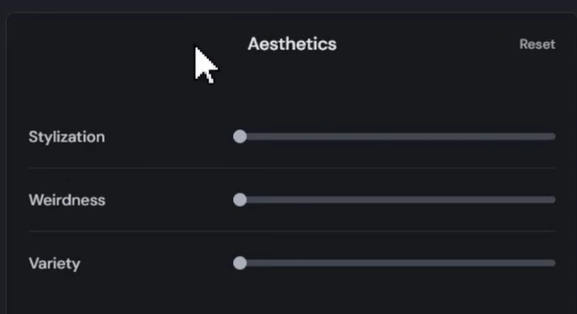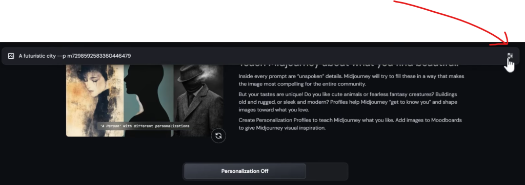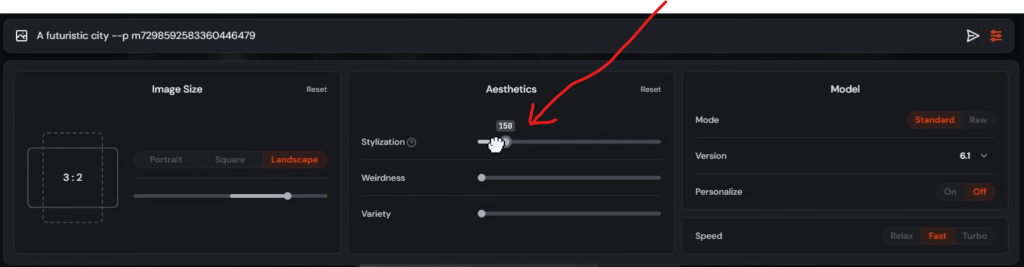 スタイライズの値は100がデフォルトで、プロンプトとムードボードの中間となるバランス値になっている。スタイライズを含めたパラメーターの値は、プロンプトの入力欄右側にあるアイコンをクリック。