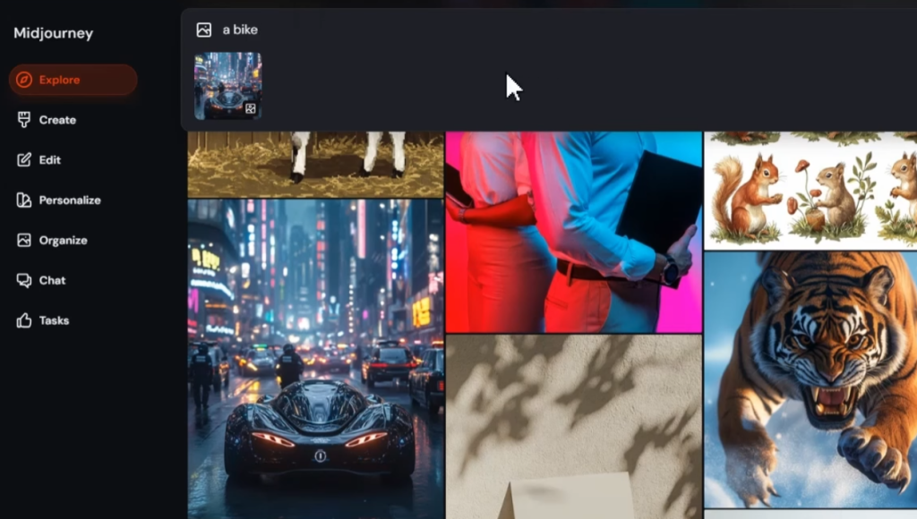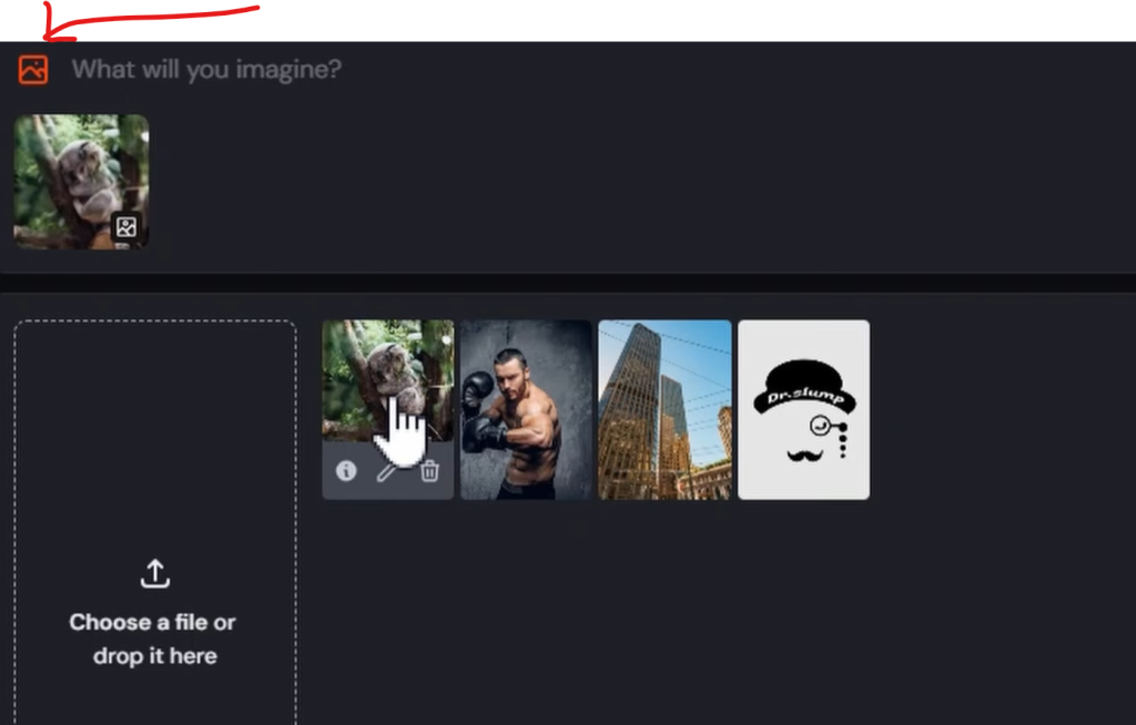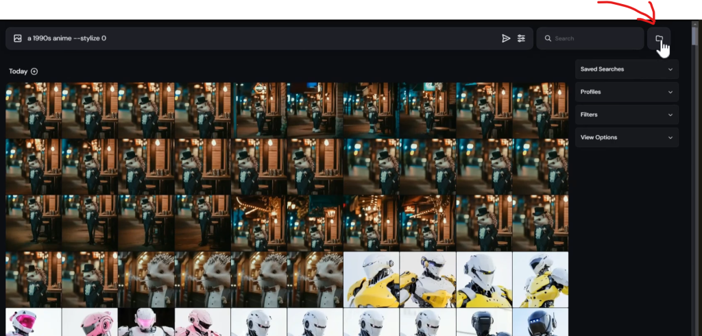 『ミッドジャーニー(Midjourney)』に入れた画像のプロンプトを知りたい場合には、左上の画像アイコンをクリック。するとPC上から入れたもの一覧が出るので、