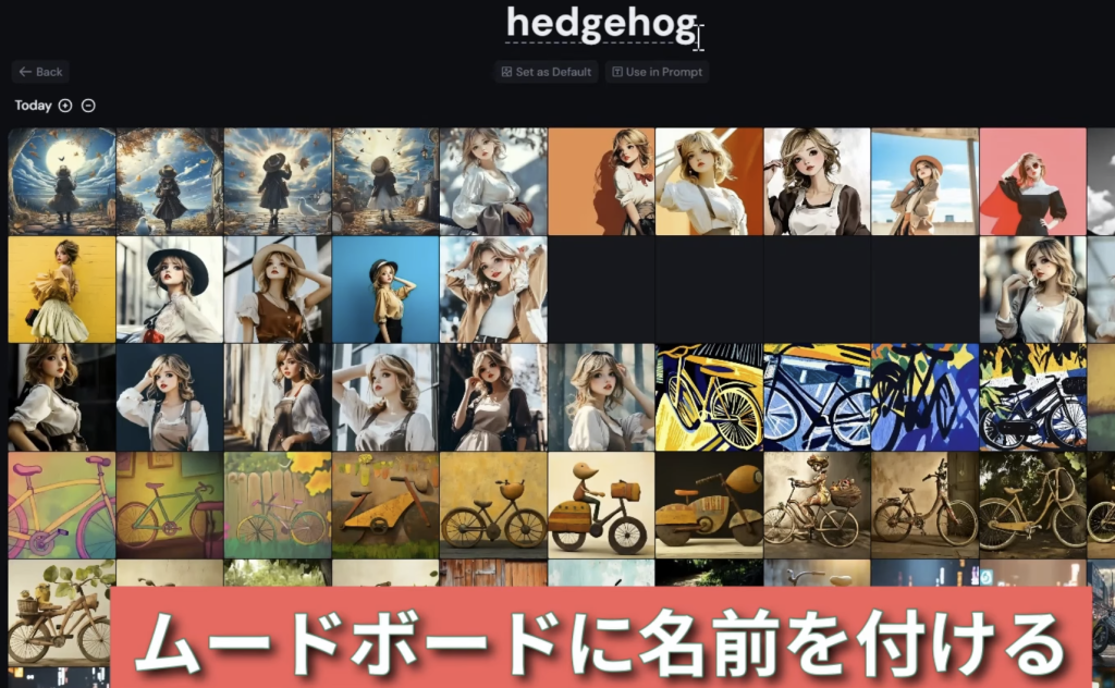 例えば、ハリネズミ画像と同じ雰囲気のムードボードを作成したい場合。それら複数枚を選択。その上でムードボードの名前を変更。分かりやすいものに。