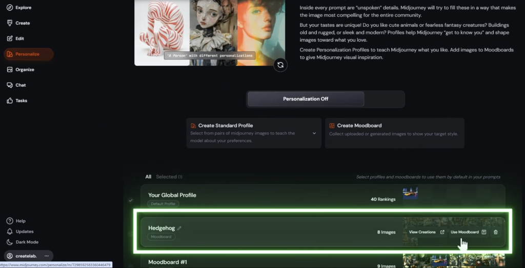 ←Back で戻ると、Personalize(パーソナライズ)の項目に名付けたムードボードが作成されているのが分かる。