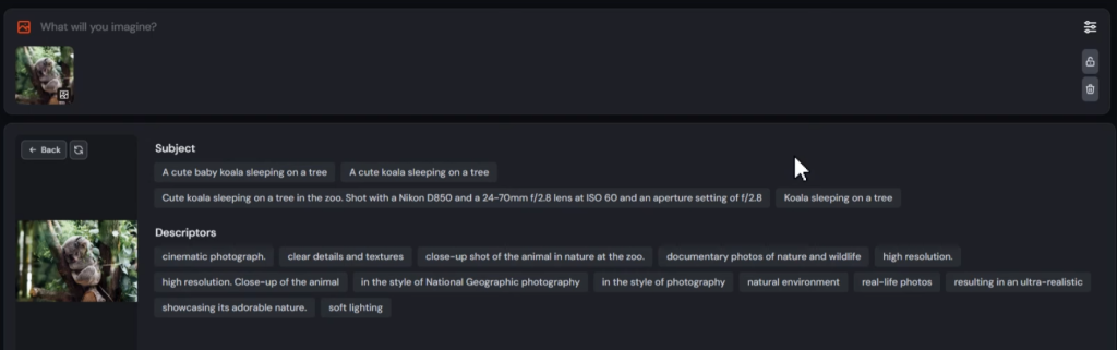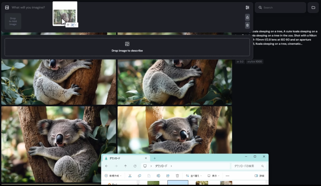 もう一つの方法が「Drop image to describe」で、説明文として出される。